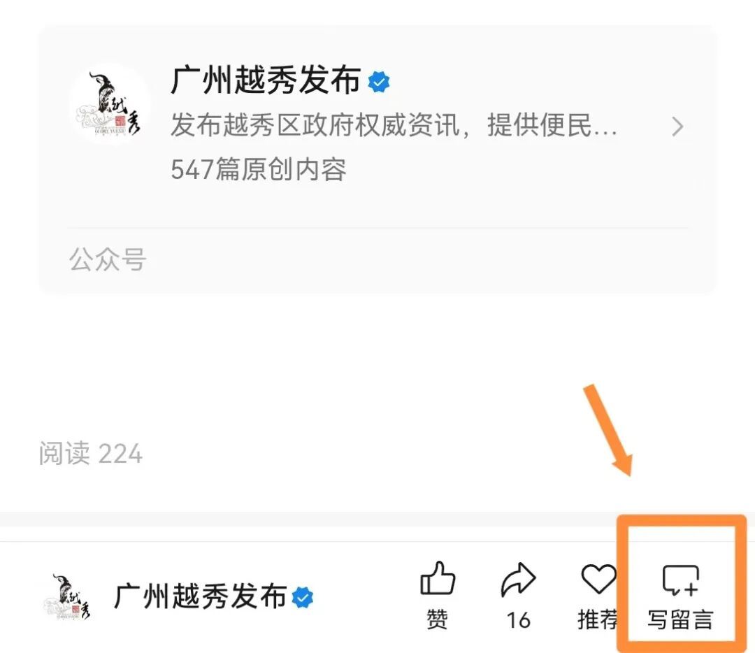 1.关注“广州越秀发布”微信公众号。